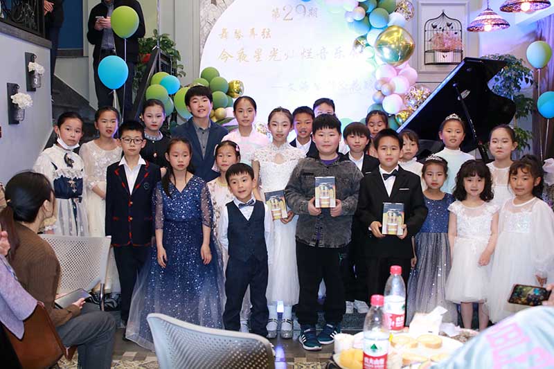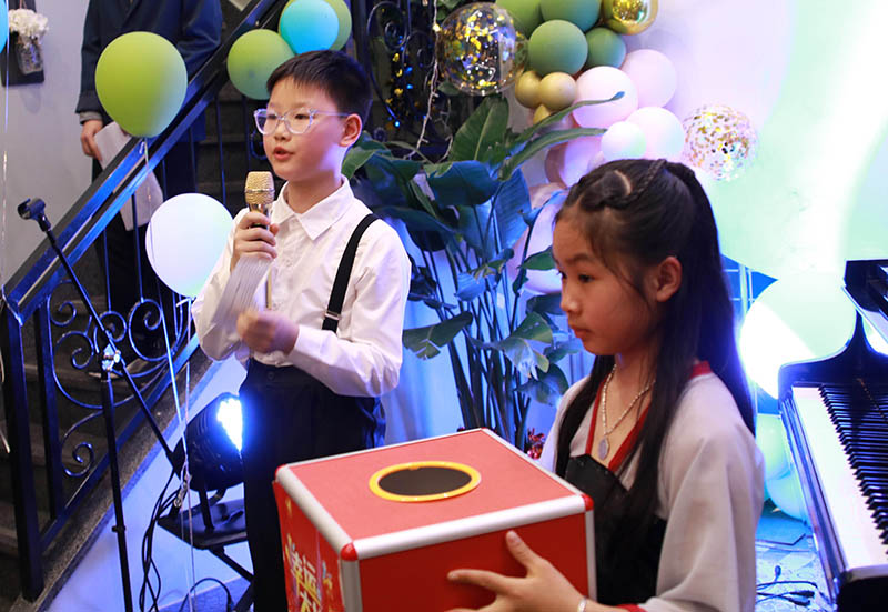 金华文海琴行第29期今夜星光灿烂音乐会于3月27号圆满结束!音乐会在环境优雅的咖啡厅举行。我们的活动内容很丰富,有音乐演奏演唱节目,期间随时可以品尝水果、茶歇、甜点,有数个抽奖环节,有专业老师的现场点评和指导。音乐会在方同学的钢琴独奏《山丹丹花开红艳艳》声中拉开帷幕、何同学的独唱《梨花又开放》、图图及他的小伙伴带来的吉他组合《少年》、廖同学的独唱《祖国慈祥的母亲》等精彩的表演把音乐会推向了一个又一个高潮!音乐会在抽取一等奖的欢乐声中圆满结束!
